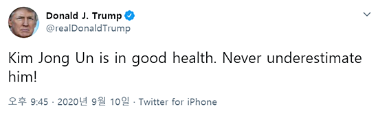 11월 대선에 올인 중인 도널드 트럼프 미국 대통령이 10일(현지시각) 불쑥 “김정은은 건강하다. 절대로 그를 과소평가하지 말라!”라는 트윗을 올렸다.