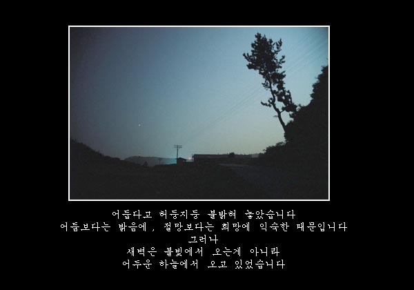 비무장지대와 그 접경지역에서의 만남 [3] 사진 / 글 : 이시우 * 이 사진시집의 내용을 저작권자의 허락없이 복사, 전재하는 행위를 금합니다 * 저작권자 © 통일뉴스 무단전재 및 재배포 금지 외부기고 tongil@tongilnews.com SNS 기사보내기 페이스북(으)로 기사보내기 트위터(으)로 기사보내기 카카오스토리(으)로 기사보내기 카카오톡(으)로 기사보내기 URL복사(으)로 기사보내기 이메일(으)로 기사보내기 다른 공유 찾기 기사스크랩하기 북, 각 대학들에 창조형 인재육성을 위한 교육환경 구축 북, 9차 당대회 앞두고 '강원도정신' 연일 강조...연말 성과 독려 응원봉 다시 들고 나온 시민들, 사법부 규탄 트럼프 “우크라이나 종전, 몇 가지 이견만 남아” 청주한씨와 [청주한씨족보]에 관하여 김 총리, “신속하고 확실하게 내란 정리해야” 댓글삭제 삭제한 댓글은 다시 복구할 수 없습니다. 그래도 삭제하시겠습니까? 비밀번호 닫기 기사 댓글 0 댓글 접기 로그인 후 이용 가능합니다. 댓글 내용입력 비회원 로그인 이름 비밀번호 댓글 내용입력 댓글쓰기 계정을 선택하시면 로그인·계정인증을 통해 댓글을 남기실 수 있습니다. 회원 로그인 비회원 글쓰기 이름 비밀번호 자동등록방지 로그인 옵션 창닫기