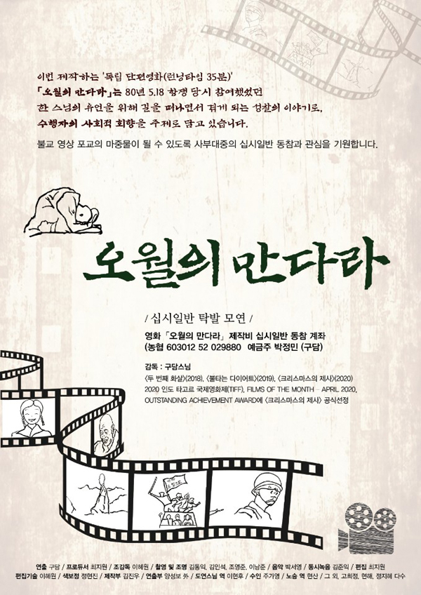 오월의 만다라 오월의 만다라는 80년 5.18 항쟁 당시 참여했었던 한 스님의 유언을 위해 길을 떠나면서 겪게 되는 성찰의 이야기로 수행자의 사회적 회향을 주제로 삼고 있다. 저작권자 © 통일뉴스 무단전재 및 재배포 금지 통일뉴스 tongil@tongilnews.com 다른기사 보기 SNS 기사보내기 페이스북(으)로 기사보내기 트위터(으)로 기사보내기 카카오스토리(으)로 기사보내기 카카오톡(으)로 기사보내기 URL복사(으)로 기사보내기 이메일(으)로 기사보내기 다른 공유 찾기 기사스크랩하기 북, 각 대학들에 창조형 인재육성을 위한 교육환경 구축 북, 9차 당대회 앞두고 '강원도정신' 연일 강조...연말 성과 독려 응원봉 다시 들고 나온 시민들, 사법부 규탄 트럼프 “우크라이나 종전, 몇 가지 이견만 남아” 청주한씨와 [청주한씨족보]에 관하여 김 총리, “신속하고 확실하게 내란 정리해야” 댓글삭제 삭제한 댓글은 다시 복구할 수 없습니다. 그래도 삭제하시겠습니까? 비밀번호 닫기 기사 댓글 0 댓글 접기 로그인 후 이용 가능합니다. 댓글 내용입력 비회원 로그인 이름 비밀번호 댓글 내용입력 댓글쓰기 계정을 선택하시면 로그인·계정인증을 통해 댓글을 남기실 수 있습니다. 회원 로그인 비회원 글쓰기 이름 비밀번호 자동등록방지 로그인 옵션 창닫기
