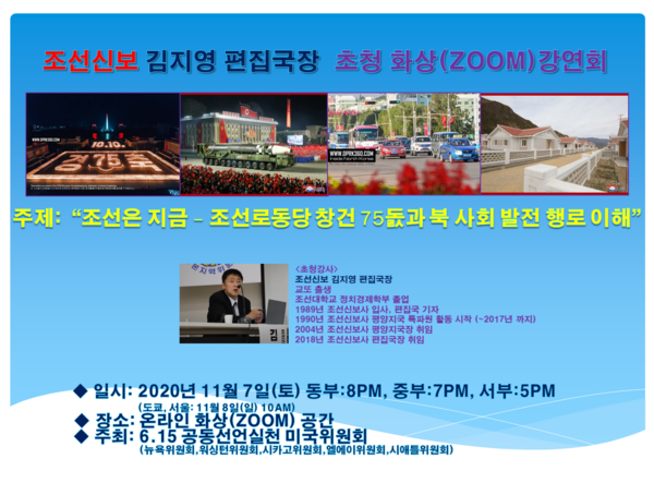 미국의 미디어들이 일제히 바이든의 당선을 보도한 지난 7일(토) 저녁 8시(미 동부시각), 온라인 공간에서 6.15 미국위(대표위원장 신필영) 주최로 “조선은 지금 - 조선로동당 창건 75돐과 북 사회 발전 행로 이해” 주제 아래 <조선신보 김지영 편집국장 초청 화상(Zoom)강연회>가 개최되었다.