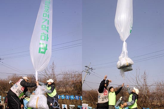 2008년 당시 자유북한운동연합이 대북전단을 살포하는 모습. [통일뉴스 자료사진]