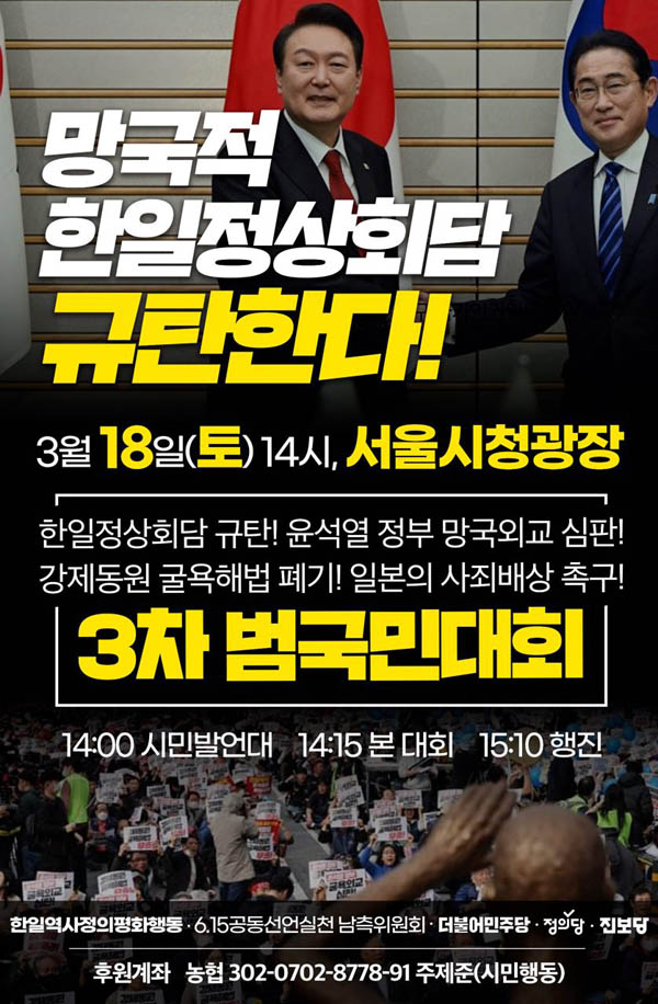 16일 일본 도쿄에서 열린 한일정상회담에 대해 규탄의 목소리가 쏟아지고 있는 가운데 한일역사정의평화행동과 6.15공동선언실천남측위원회가 야당들과 함께 주말인 18일 오후 2시 서울 시청광장에서 한일정상회담을 규탄하는 ‘3차 범국민대회’를 개최하고, 천주교정의구현전국사제단은 20일 전주에서 윤 대통령 퇴진 촉구 시국미사를 예고했다.