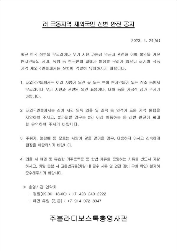 주블라디보스톡 총영사관은 24일자 ‘러 극동지역 재외국민 신변 안전 공지’(이하 공지)를 통해 “최근 한국 정부의 우크라이나 무기 지원 가능성 언급과 관련해 이에 불만을 가진 현지인들의 시비, 폭행 등 한국인 피해가 발생할 우려가 있으니 러시아 극동지역 재외국민들께서는 신변에 각별히 유의하시기 바랍니다”라고 알렸다.