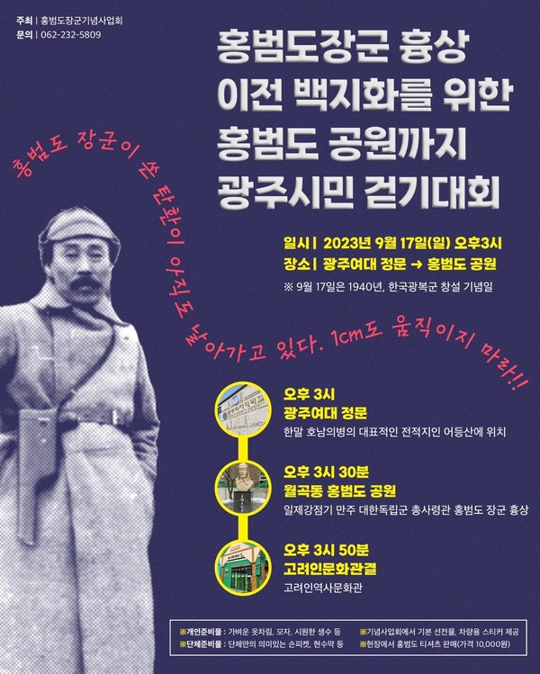 참가 문의는 광주지역 홍범도장군기념사업회 062)232-5809, 서울지역 신흥무관학교기념사업회 02)969-0226으로 하면 되고, 참가자들은 모자와 생수 등을 지참해야 한다.