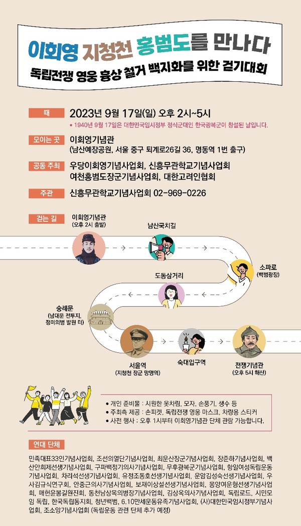 우당이회영기념사업회와 신흥무관학교기념사업회, 여천홍범도기념사업회, 대한고려인협회가 공동주최하는 ‘이회영 지청천 홍범도를 만나다 : 독립전쟁 영웅 흉상 철거 백지화를 위한 걷기대회’는 오후 2시 이회영기념관에서 모여 남산국치길, 소파로, 숭례문, 서울역, 숙대입구역을 거쳐 거쳐 전쟁기념관에서 마무리될 예정이다.