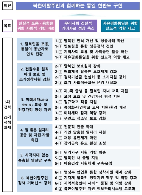 이를 위해 △탈북민을 포용, 통일의 동반자로 인식 전환 △전원수용 원칙아래 보호 및 초기정착지원 강화 △미래세대(제3국 출생 등) 교육 및 건강가정 형성 지원 △질좋은 일자리 공급 및 자립·자활 촉진 △사각지대없는 촘촘한 안전망 구축 △북한이탈주민 정책 거버넌스 강화를 6대 전략으로 정하고 25개 정책과제로 구체화했다.