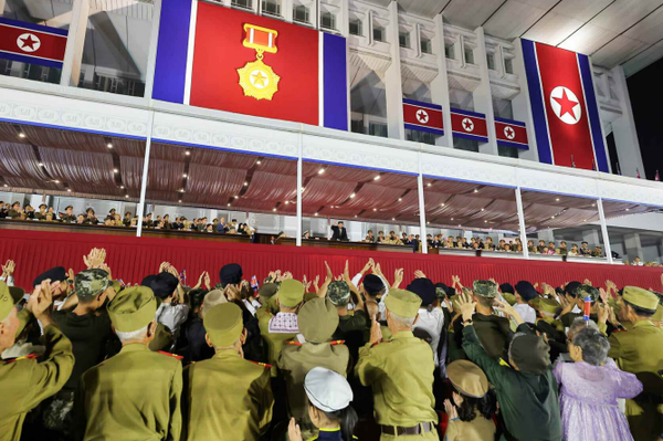 김정은 국무위원장이 27일 저녁 평양체육관 광장에서 열린 전시 상징종대들의 기념행진에 참석했다. [사진-노동신문 갈무리]