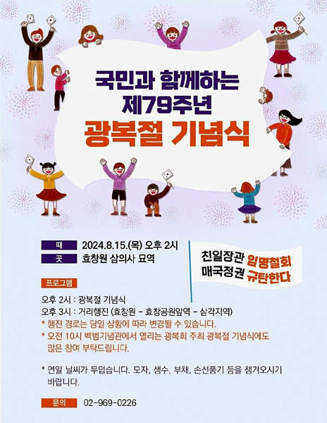 한편, ‘민족공동행사준비위원회’는 15일 2시 서울 천도교 중앙대교당에서 독립유공자유족회와 한민족운동단체연합 등이 주관하는 ‘제79주년 8.15광복절 민족공동행사 및 삼일독립정신 범국민운동본부 출범식’을 개최한다.