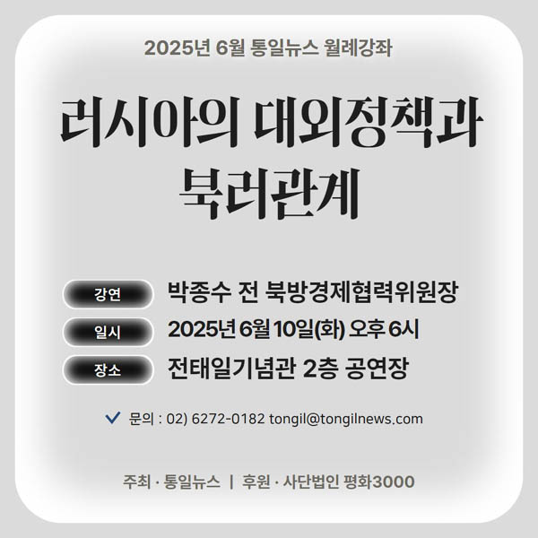 통일뉴스 월례강좌는 평화3000이 후원하고 있으며, 6월 강좌는 오는 6월 10일 오후 6시 전태일기념관에서 박종수 전 북방경제협력위원장이 ‘러시아의 대외정책과 북러관계’를 주제로 진행한다.