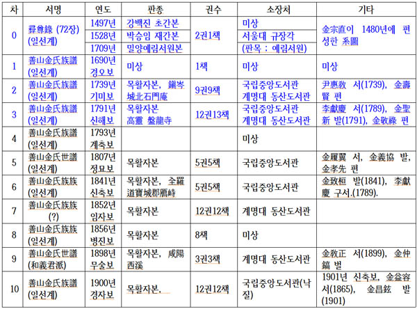 일선김씨 문중에서 조선시대에 간행한 중요한 족보를 정리하면 아래의 [표1]과 같다. 이 목록에 점필재 김종직 편찬의 [이존록]을 0번으로 하였다. 그 만큼 [이존록]은 계보학 연구에 중요한 책이다.