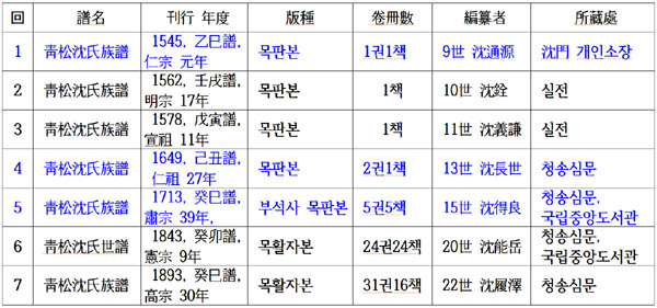 청송심문은 우리나라의 대표적인 명문가로서 조선시대에 7차에 걸쳐 중요한 족보를 편찬하였다. 이중 세 번은 임란전에 족보를 편찬한 것이다. 이를 정리한 [표1]을 참조하기를 바란다.