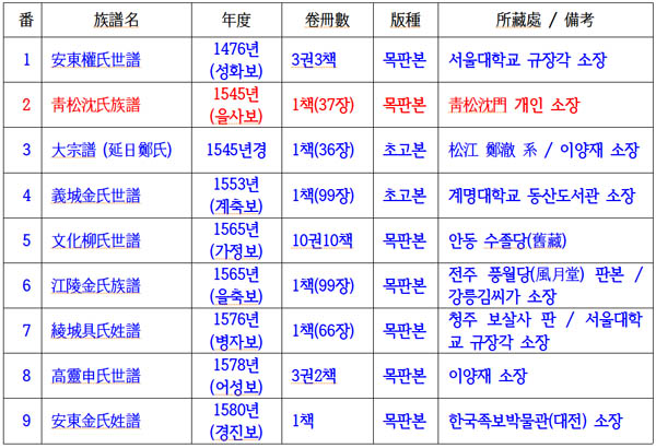 그러나 필자가 확인한 바는 임진왜란(1592년) 이전, 조선 전기에 족보를 편찬한 문중은 30여 문중이고, 그 가운데 아홉 문중의 족보가 현전하는 것으로 확인되고 있다. 현전하는 9종 가운데 7종은 목판본이고, 2종은 초고본(草稿本)이다.