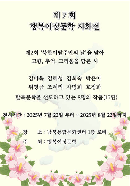 22일 제2회 ‘북한이탈주민의 날’을 맞아 서울 강서구 남북통합문화센터 1층 로비에서 행복여정문학에서 주최한 제7회 시화전이 열렸다. 고향, 추억, 그리움을 담은 시 15편이 8월 22일까지 전시된다.