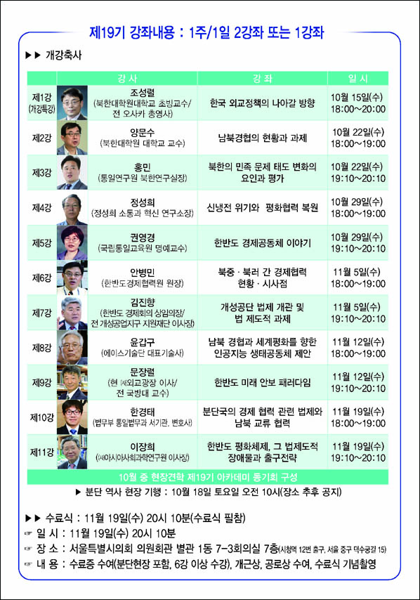 강사로는 양문수 북한대학원대학교 교수, 홍민 통일연구원 북한연구실장, 정성희 소통과혁신 연구소장, 권영경 국립통일교육원 명예교수, 안병민 한반도경제협력원 원장, 김진향 전 개성공업지구지원재단 이사장, 윤갑구 에이스기술재단 대표이사, 문장렬 외교광장 이사, 한경태 법무부 통일법무과 서기관, 이장희 한국외대 명예교수 등이 나선다.