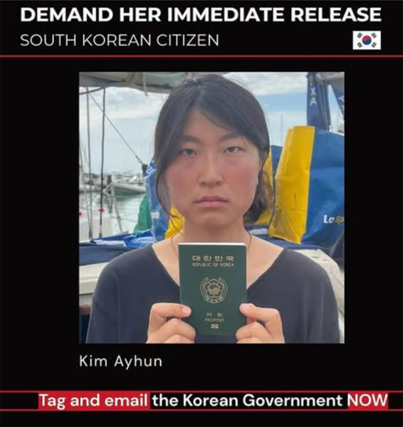 내외신 보도에 따르면, 8일 오전 11시 40분쯤 가자지구로 향하던 구호선단 11척이 이스라엘군에 나포됐으며 이 선단에는 한국 국적 활동가 한 명도 탑승하고 있는 것으로 알려졌다. 페이스북 등 SNS에서는 나포된 김아현(활동명 혜초) 활동가의 무사 귀환을 촉구하는 글들이 나돌고 있다.