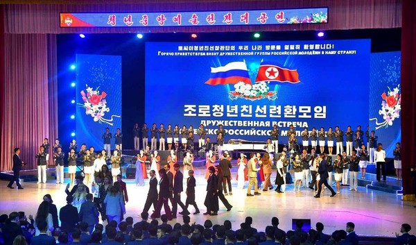 북한을 방문중인 러시아청년친선참관단과 사회주의애국청년동맹 사이에 '조로청년친선련환모임'이 21일 청년중앙회관에서 진행됐다. [사진-노동신문]