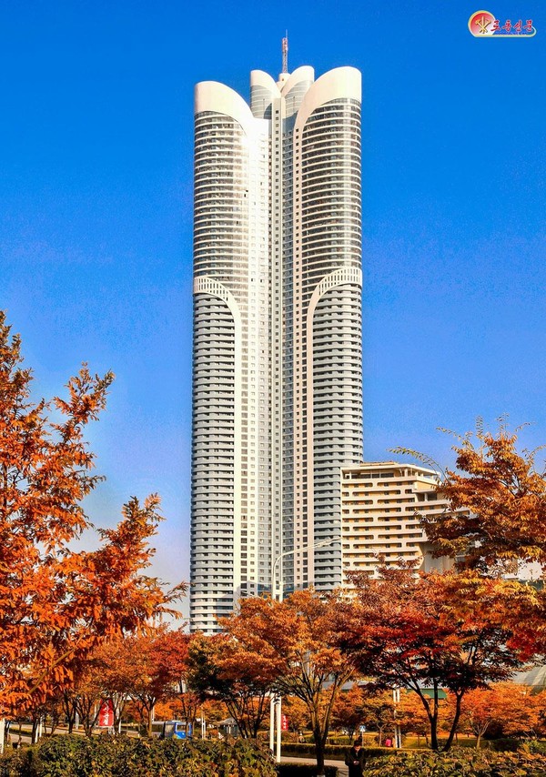 올해 4월 입주를 시작한 화성지구 3단계 1만세대 상징건물과 보통강 기슭의 다락식주택구가 본래 한 몸인 듯 단풍과 어우러져 자태를 드러내고, 평양시 5만세대 건설의 첫 대상으로 2022년 4월 완공한 송화거리 80층 아파트도 가을 단풍을 앞세워 우뚝 서있다.