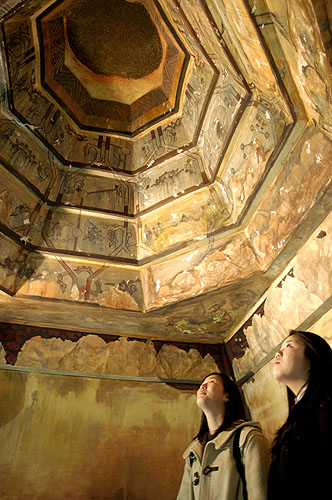 | ▶송인혜, 송진영 학생이 덕흥리2호무덤 내부를 관람하고 있다.[사진 - 통일뉴스 송정미기자] |