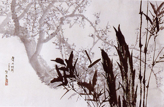 화면 앞쪽에 참대와 죽순을 강하고 힘 있게, 뒤쪽의 매화는 은은하게 그렸다. 알다시피 매화와 대나무는 난초, 국화와 함께 조선시대 선비들이 즐겨 그렸던 소재이다. 겨울 한파를 이기고 제일 먼저 꽃을 피우는 매화와 곧게 자라는 대나무는 현재 북한의 모습을 간접적으로 보여준다. 단순하지만 강한 필선과 대비를 통해 시대의 흐름을 관통하는 대가의 풍모가 느껴진다.
