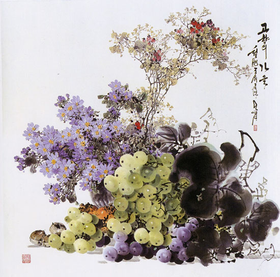 오영성은 1964년 생으로 다른 화가에 비해 매우 젊다. 하지만 만수대창작사에서 조선화창작단 단장을 맡고 있을 정도로 유망주이다. <고향의 가을>이라는 작품은 우리의 정물화에 가깝다. 하지만 서양식과는 전혀 다르다. 맑고 간결하며 화사한 전형적인 조선화풍의 정물화이다.