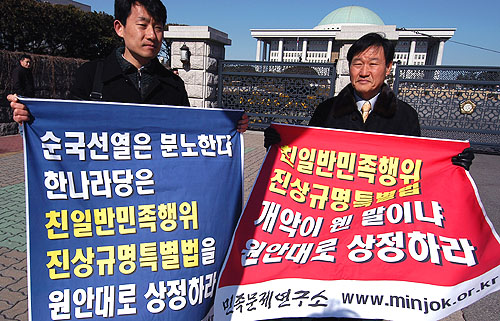 한편 국회 앞에선 민족문제연구소 이건 운영위원장, 박한용 연구원, 방학진 사무국장등이 오전 10시부터 친일진상규명법 '개악'을 규탄하는 1인 시위를 열고 이 법을 원안대로 상정할 것을 요구했다.