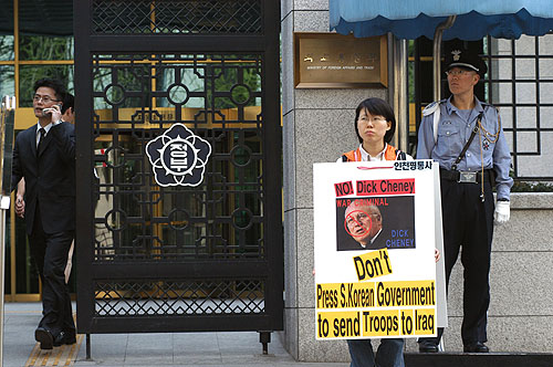 인천평통사 김강연 사업부장과 서울평통사 최문희 사업부장은 오전 8시부터 11시 30까지 외교부 청사 앞에서 1인시위를 벌였다. 김강연 부장은 "외교부 직원들의 출근과 이라크 일일 정세점검 회의가 열리는 8시 20분에 맞춰 아침 1인시위를 진행했고, 내외신 기자회견에 맞춰 영문 피켓으로 1인시위를 했다"며 "출근하는 외교부 직원들은 관심있게 봤고, 회사에 출근하는 유심히 보고 갔다. 외신 기자들도 사진취재를 했다"고 말했다. 이들은 체니 부통령의 방한에 맞춰 '그림자' 1인시위를 계속하는 것은 물론 내일 저녁 반기문 외교통상부 장관이 알자지라TV와 회견하는 동안 한남동 장관공관 앞에서 인천평통사 오혜란 공동대표가 1인시위를 진행할 예정이라고 전했다. |