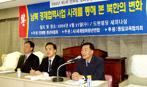 이런 가운데 민화협 청년위원회가 주최하고 (사)세계평화청년연합의 주관으로 '남북경제협력사업 사례를 통해 본 북한의 변화'라는 주제로 '2004년 제1회 민화협 평화통일 청년포럼'이 21일 저녁 7시 마포 도원빌딩 세미나실에서 50여명이 참석한 가운데 열렸다.