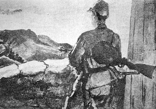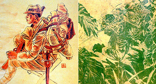 ▶운보 김기창(1914-2001)의 그림. 왼쪽은 잘 알려진 [총후병사](1944년작), 오른쪽은 [적진육박](1944년작, 결전미술전 조선군보도부장상 수상)