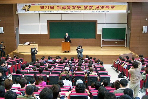 반 장관은 정치외교학과 학생들을 대상으로 한 이날 특강에서 무리하게 '동등외교'를 펼치려 하면 "개념상에서도 혼란이 생기고 우리 자존심에도 흠만 가는 상황이 될 것이다"고 경고하며 과거사 문제와 중국의 동북공정 문제가 나올 때마다 이를 속시원히 해결하길 바라는 국민적 요구가 있는 것은 알지만 "국가 간 서로 존중하는 관계 속에서 우리의 입장을 전달"함을 외교의 기준으로 세워야 한다고 강조하고 정치외교학과 학생들에게 "직접 여러분이 해 보시면 실감날 것"이라 심경을 토로하기도 했다.