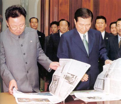 김대중 대통령과 김정일 국방위원장이 백화원 영빈관에서 2차 단독정상회담에 앞서 서울에서 보내온 두 정상의 첫 만남을 대서특필한 조간신문을 살펴 보고 있다. 저작권자 © 통일뉴스 무단전재 및 재배포 금지 연합뉴스 tongil@tongilnews.com SNS 기사보내기 페이스북(으)로 기사보내기 트위터(으)로 기사보내기 카카오스토리(으)로 기사보내기 카카오톡(으)로 기사보내기 URL복사(으)로 기사보내기 이메일(으)로 기사보내기 다른 공유 찾기 기사스크랩하기 북, 각 대학들에 창조형 인재육성을 위한 교육환경 구축 북, 9차 당대회 앞두고 '강원도정신' 연일 강조...연말 성과 독려 응원봉 다시 들고 나온 시민들, 사법부 규탄 트럼프 “우크라이나 종전, 몇 가지 이견만 남아” 청주한씨와 [청주한씨족보]에 관하여 김 총리, “신속하고 확실하게 내란 정리해야” 댓글삭제 삭제한 댓글은 다시 복구할 수 없습니다. 그래도 삭제하시겠습니까? 비밀번호 닫기 기사 댓글 0 댓글 접기 로그인 후 이용 가능합니다. 댓글 내용입력 비회원 로그인 이름 비밀번호 댓글 내용입력 댓글쓰기 계정을 선택하시면 로그인·계정인증을 통해 댓글을 남기실 수 있습니다. 회원 로그인 비회원 글쓰기 이름 비밀번호 자동등록방지 로그인 옵션 창닫기