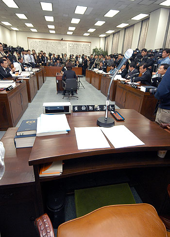 여.야 의원들은 약속된 시간인 오후 8시30분경 모두 착석했으나 정작 회의를 주관해야 하는 최연희(한나라당) 법사위원장이 1시간 20여분이 넘은 9시 50분 현재까지 나타나지 않아 개회가 늦어지고 있다.