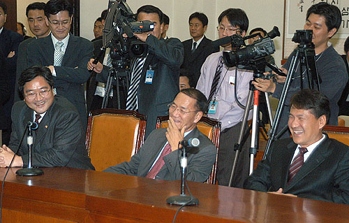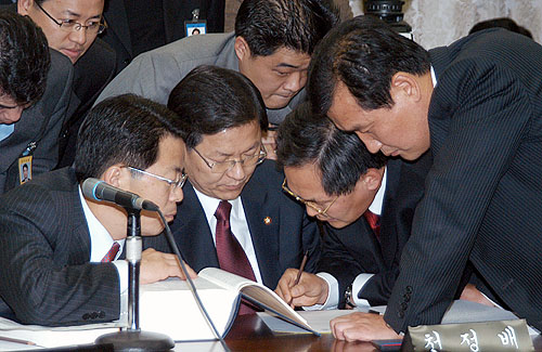 열린우리당 의원들은 최연희 법사위원장이 끝까지 얼굴을 보이지 않을 경우 6시간여에 걸친 논의가 모두 무산될 수 있다는 위기감에 모여서 대책을 논의하는 등 긴장감을 보이고 있다. 천정배 열린우리당 원내대표와 선병렬 의원만이 한나라당 주성영 의원등과 농담을 주고받으며 굳은 얼굴을 피려고 노력하고 있다.
