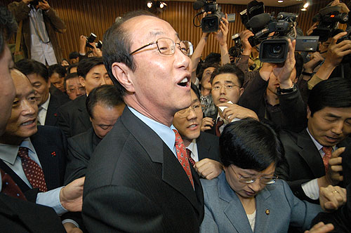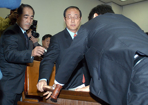 밤 11시 30분경 드디어 회의장에 들어선 최연희 법사위원장은 열린우리당이 한나라당의 ‘시간끌기’ 작전에 항의하며 의사일정변경동의안을 표결로 처리해줄 것을 요구하자 서둘러 산회를 선포했다.