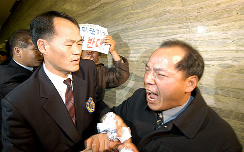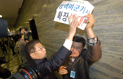 ▶7일 통외통위 회의에서 용산협정과 LPP개정협정이 통과됐으며, 평통사와 평택주민 등은 국회 안에서 시위를 벌이며 격렬하게 항의했다. [사진 - 통일뉴스 김규종기자]