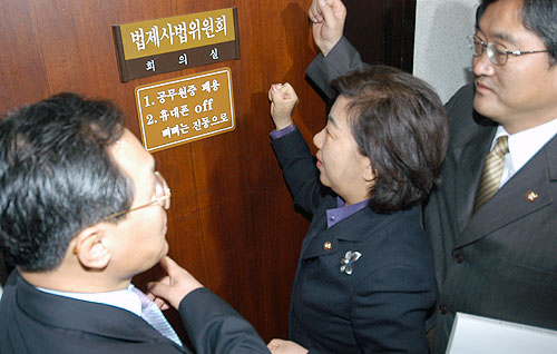 열린우리당 이은영 의원이 “법사위원입니다. 문좀 여세요”라고 거듭 요구했으나 묵묵부답. 같은 당 우원식 의원은 “오늘 오후 2시부터 4시까지 토론회합니다, 법사위 소회의실에서 합니다. 참석하세요”라고 통보했다. 최채천 의원도 2시부터 토론회가 있다고 알리고, “한나라당도 좋아할 겁니다. 개정론자도 참석합니다, 오세요”라고 재촉했다.
