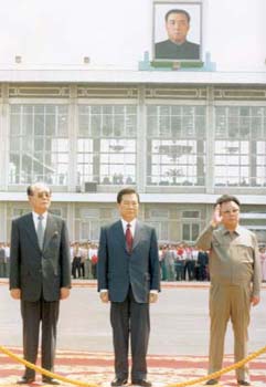 김대중 대통령이 평양 순안공항에 도착하여 환영 나온 김정일 국방위원장, 김영남 최고인민회의 상임위원장과 함께 김일성 주석 초상화를 배경으로 사열하고 있다. 저작권자 © 통일뉴스 무단전재 및 재배포 금지 연합뉴스 tongil@tongilnews.com SNS 기사보내기 페이스북(으)로 기사보내기 트위터(으)로 기사보내기 카카오스토리(으)로 기사보내기 카카오톡(으)로 기사보내기 URL복사(으)로 기사보내기 이메일(으)로 기사보내기 다른 공유 찾기 기사스크랩하기 북, 각 대학들에 창조형 인재육성을 위한 교육환경 구축 북, 9차 당대회 앞두고 '강원도정신' 연일 강조...연말 성과 독려 응원봉 다시 들고 나온 시민들, 사법부 규탄 트럼프 “우크라이나 종전, 몇 가지 이견만 남아” 청주한씨와 [청주한씨족보]에 관하여 김 총리, “신속하고 확실하게 내란 정리해야” 댓글삭제 삭제한 댓글은 다시 복구할 수 없습니다. 그래도 삭제하시겠습니까? 비밀번호 닫기 기사 댓글 0 댓글 접기 로그인 후 이용 가능합니다. 댓글 내용입력 비회원 로그인 이름 비밀번호 댓글 내용입력 댓글쓰기 계정을 선택하시면 로그인·계정인증을 통해 댓글을 남기실 수 있습니다. 회원 로그인 비회원 글쓰기 이름 비밀번호 자동등록방지 로그인 옵션 창닫기