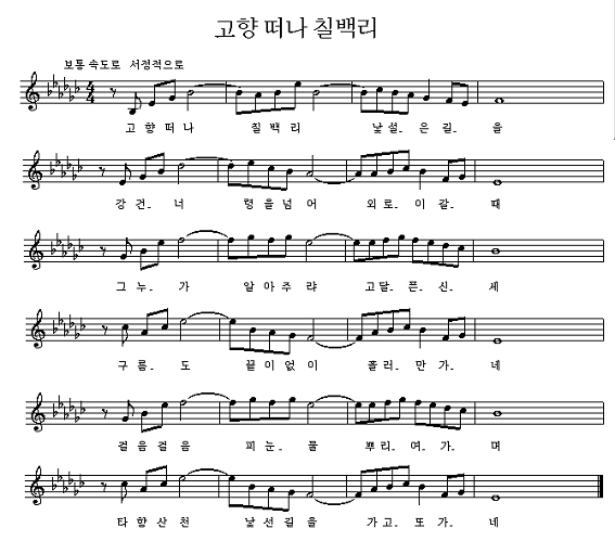 노래의 첫 부분은 이러한 독특한 선율정서적 흐름으로 고향 떠나 머나먼 낯 설은 길을 외로이 가는 주인공의 모습, 구슬픈 심리세계를 선명하게 형상하고 있다.