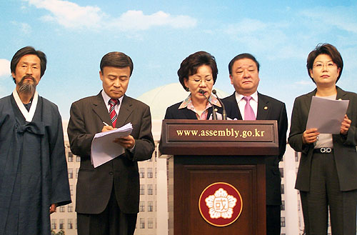 한일협정 재체결 촉구 국회결의안은 김원웅, 강창일, 김재홍, 장복심, 김태홍, 강기갑, 이상민, 홍미영, 강혜숙, 안민석, 김재윤, 정청래, 염동연, 이종걸, 선병렬, 김낙순, 이혜훈, 신국환, 안상수, 장향숙, 현애자, 장기정, 이재오, 정병국, 천영세, 권오을, 김태년 등 27인이 공동발의했다.