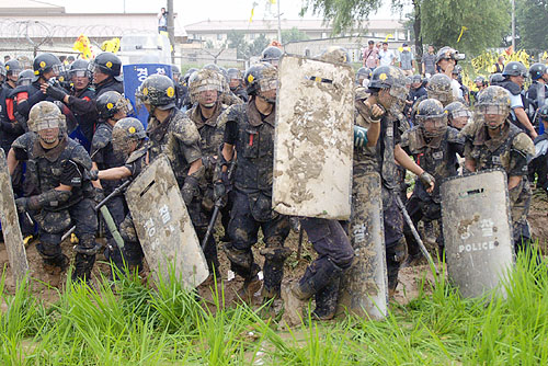 그건 아마도 시위대와 경찰과 격렬한 충돌을 빚은 뒤, 잠시 양측이 가진 '소강 상태'가 아닌가 싶다. 논두렁과 도랑, 비좁은 도로가 만들어낸 지형으로 인해 경찰 병력 속에 시위대가 섞여 있었고 시위대 속에서도 경찰 병력이 섞여 있는 진풍경이 연출됐다. '진흙인형'이 되버린 경찰병력과 질척한 논두렁 어디엔가 신발을 꽂아놓은 '맨발의 청춘'들이 서로 한숨을 돌리는 순간이었다.