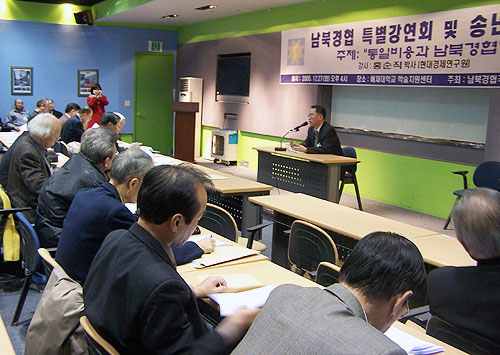 강연회는 1시간 30분 가량 진행됐으며 토론회 참석자 40여명은 뒤이어 송년회 밤 행사를 열고 올해 남북경협사업에 대해 평가하고 친목을 다지는 시간을 가졌다.