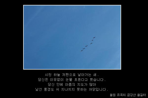 사진 / 글 : 이시우 **사진시집의 내용을 저작권자의 허락없이 복사, 전재하는 행위를 금합니다 ** 저작권자 © 통일뉴스 무단전재 및 재배포 금지 외부기고 tongil@tongilnews.com SNS 기사보내기 페이스북(으)로 기사보내기 트위터(으)로 기사보내기 카카오스토리(으)로 기사보내기 카카오톡(으)로 기사보내기 URL복사(으)로 기사보내기 이메일(으)로 기사보내기 다른 공유 찾기 기사스크랩하기 북, 각 대학들에 창조형 인재육성을 위한 교육환경 구축 북, 9차 당대회 앞두고 '강원도정신' 연일 강조...연말 성과 독려 응원봉 다시 들고 나온 시민들, 사법부 규탄 트럼프 “우크라이나 종전, 몇 가지 이견만 남아” 청주한씨와 [청주한씨족보]에 관하여 김 총리, “신속하고 확실하게 내란 정리해야” 댓글삭제 삭제한 댓글은 다시 복구할 수 없습니다. 그래도 삭제하시겠습니까? 비밀번호 닫기 기사 댓글 2 댓글 접기 로그인 후 이용 가능합니다. 댓글 내용입력 비회원 로그인 이름 비밀번호 댓글 내용입력 댓글쓰기 계정을 선택하시면 로그인·계정인증을 통해 댓글을 남기실 수 있습니다. 회원 로그인 비회원 글쓰기 이름 비밀번호 자동등록방지 로그인 옵션 창닫기 댓글목록 최신순 추천순 욕설, 타인비방 등의 게시물은 예고 없이 삭제 될 수 있습니다. 강미숙 2003-05-01 12:00:00 더보기 삭제하기 초등학교아이의숙제로싸이트에들어왔습니다. 너무나아름다운사진과글에제마음을들킨것같아글을씁니다 하나의사진과글이이런커다란위안을어떤여건과사건앞에동일한다는게 새삼느끼며감사글을보냅니다 좋은하루되세요 김건우 2002-07-18 12:00:00 더보기 삭제하기 너무 재미있는 일을 하시네요. 이시우님은.. 저도 아직 활성화되지 않은 이 분야에 깊은 관심을 가지고 열심히 사진 찍고 글도 쓰고 있습니다. 멋집니다.^^