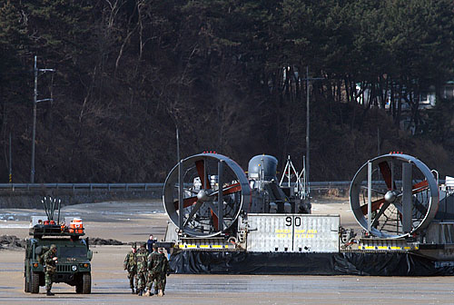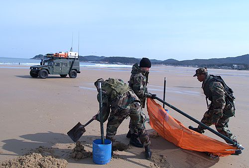 ▶상륙연습에 쓰일 표시물을 설치중인 미군들. [사진 - 통일뉴스 정명진 기자]