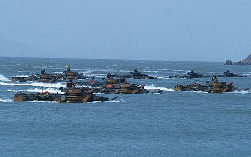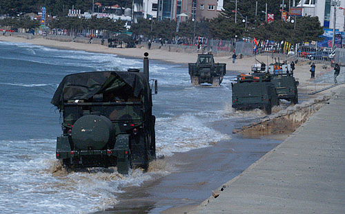 ◎ 수륙양용상륙장갑차 40여대 해상에서 쏟아져 나와