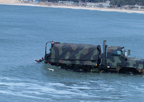 ▶밀려오는 바닷물에 쫓겨 미군차량을 이동시키고 있다. [사진 - 통일뉴스 정명진 기자]