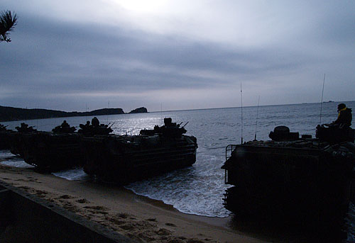 이 장갑차들은 '乙'자 형을 그리면서 파도를 헤치고 천천히 다가오기 시작했다. 연안에 가까워지면서 흰색, 황색 연막탄을 내뿜기도 했으며, 모래사장에 접안하자 궤도를 내보이며 한줄로 정렬했다.