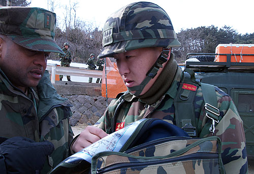 ▶한국군과 미군 현장지휘관이 지도를 펼쳐가며 준비상황을 점검중이다. [사진 - 통일뉴스 정명진 기자]