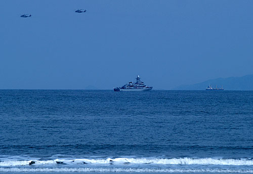 ▶사전준비전 해상의 초계함과 헬기. [사진 - 통일뉴스 정명진 기자]