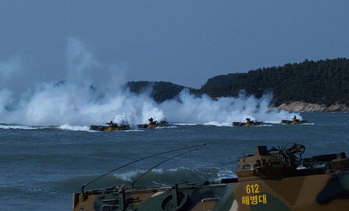 ▶수중에서 몰려오는 수륙양용상륙장갑차. 앞에 보이는 갈색이 한국군해병대, 뒤쪽 검은색이 미군.[사진 - 통일뉴스 정명진 기자]