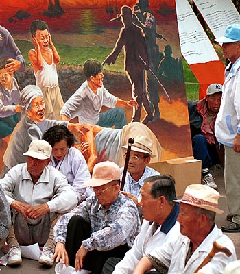 | ▶`점령군`이라는 작품앞에 앉아 행사를 지켜보는 노인들. (사진 - 통일뉴스 송정미기자) |