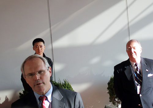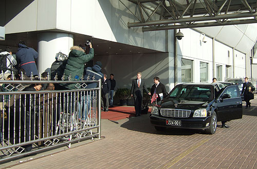 오후 1시 30분경(한국시간 오후 2시 30분, 이하 중국 현지시간) JAL781편으로 일본 대표단과 함께 공항에 도착한 힐 차관보는 추운 날씨 탓이지 상기된 표정으로 자신을 기다리던 수많은 기자들 앞에 섰으나 구체적인 답변은 피한채 신중한 태도로 간략하게 답했다.